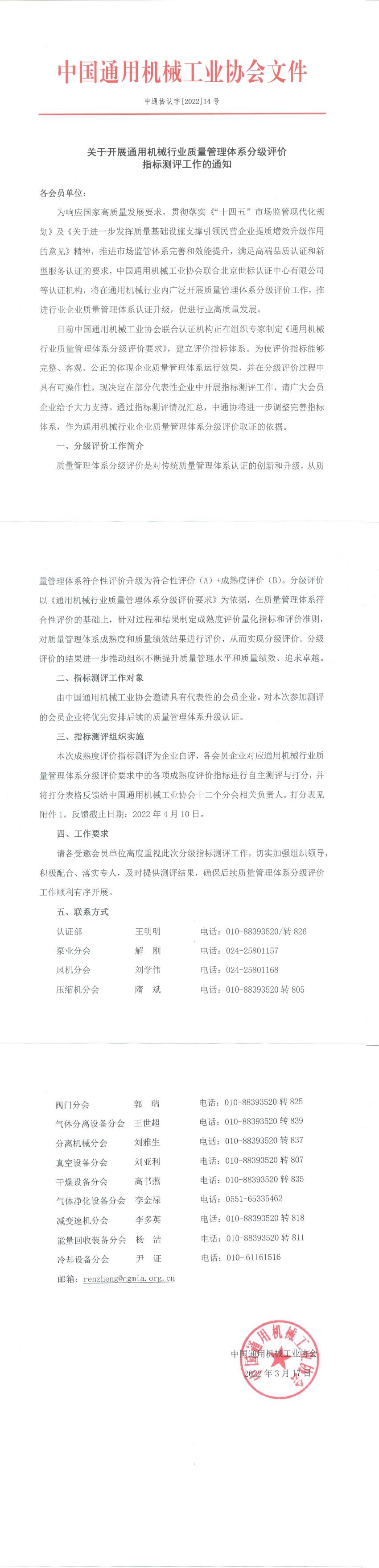 本次成熟度評(píng)價(jià)指標(biāo)測(cè)評(píng)為企業(yè)自評(píng),各會(huì)員企業(yè)對(duì)應(yīng)通用機(jī)械行業(yè)質(zhì)量管理體系分級(jí)評(píng)價(jià)要求中的各項(xiàng)成熟度評(píng)價(jià)指標(biāo)進(jìn)行自主測(cè)評(píng)與打分,并將打分表格反饋給中國(guó)通用機(jī)械工業(yè)協(xié)會(huì)十二個(gè)分會(huì)相關(guān)負(fù)責(zé)人。打分表見附件1。反饋截止日期:2022年4月10日。