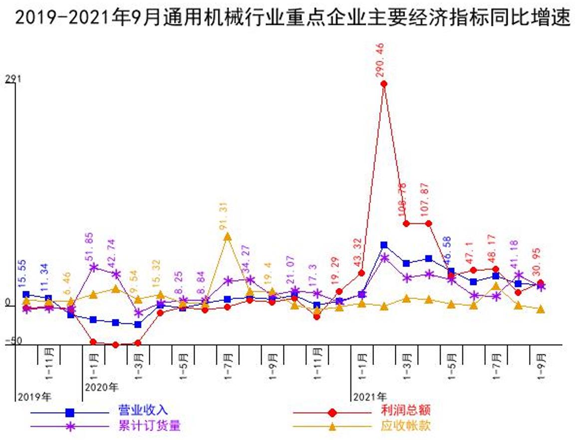 今年1-9月,通用機(jī)械行業(yè)重點(diǎn)聯(lián)系企業(yè)主要經(jīng)濟(jì)運(yùn)行指標(biāo)各月同比增速保持了20%以上的增長。去年突發(fā)疫情影響造成的數(shù)據(jù)巨大波動在行業(yè)經(jīng)濟(jì)運(yùn)行穩(wěn)定持續(xù)的恢復(fù)中逐步得到修復(fù),同比增速呈現(xiàn)逐月回落并趨于平穩(wěn),符合行業(yè)經(jīng)濟(jì)運(yùn)行預(yù)期。前三季度行業(yè)經(jīng)濟(jì)形勢持續(xù)向好,扣除去年疫情的特殊情況因素,行業(yè)經(jīng)濟(jì)運(yùn)行呈現(xiàn)出近幾年以來的較好水平。