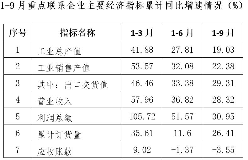 據(jù)協(xié)會對172家重點(diǎn)聯(lián)系企業(yè)統(tǒng)計(jì)數(shù)據(jù)顯示,1-9月172家重點(diǎn)聯(lián)系企業(yè)完成工業(yè)總產(chǎn)值961億元,同比增長19.03%;完成工業(yè)銷售產(chǎn)值945億元,同比增長22.38%,其中:出口交貨值70億元,同比增長29.31%;實(shí)現(xiàn)營業(yè)收入1052億元,同比增長28.32%;實(shí)現(xiàn)利潤總額87.42億元,同比增長30.95%;累計(jì)訂貨量1495.27億元,同比增長26.41%;應(yīng)收賬款427.95億元,同比下降3.55%。