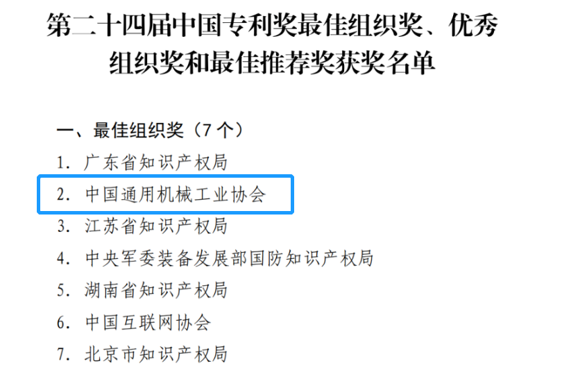7月21日,國家知識產(chǎn)權(quán)局公布了第二十四屆中國專利獎授獎最終名單,中國通用機械工業(yè)協(xié)會共推介三項專利參與評選,斬獲兩項金獎一項優(yōu)秀獎,中國通用機械工業(yè)協(xié)會也獲評最佳組織獎。