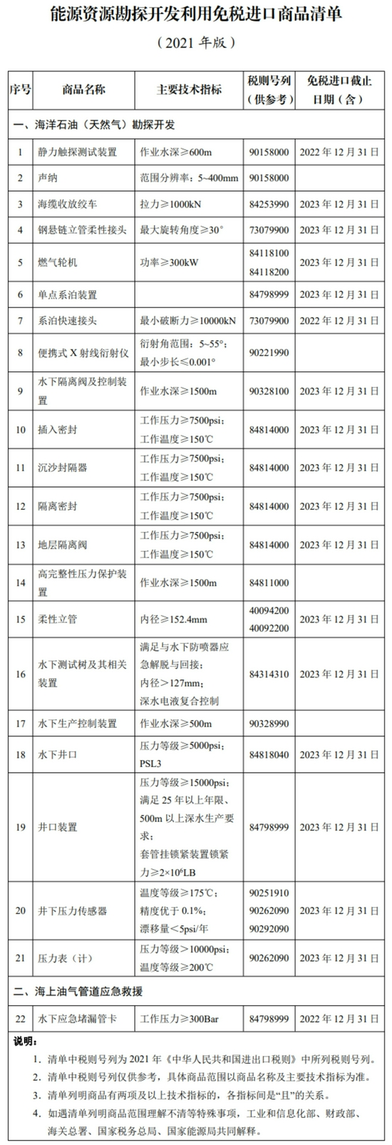 關(guān)于印發(fā)能源資源勘探開發(fā)利用免稅進(jìn)口商品清單(2021年版)的通知