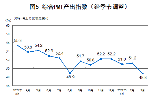 3月份,綜合PMI產(chǎn)出指數(shù)為48.8%,比上月下降2.4個(gè)百分點(diǎn),表明我國(guó)企業(yè)生產(chǎn)經(jīng)營(yíng)景氣水平有所下降。