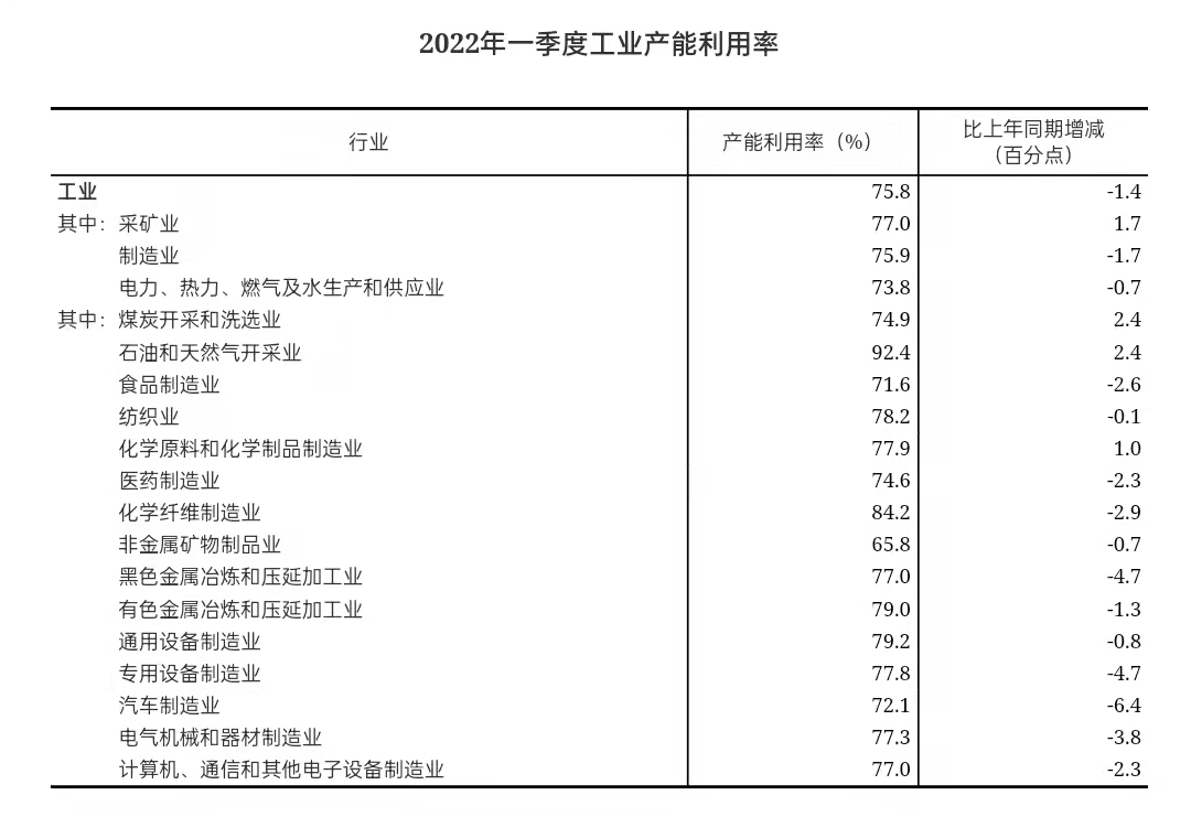 一季度,全國工業(yè)產(chǎn)能利用率為75.8%,比上年同期下降1.4個百分點,與2019年一季度基本持平。