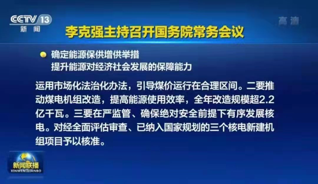 4月20日,國務(wù)院常務(wù)會議指出,要在嚴監(jiān)管、確保絕對安全前提下有序發(fā)展核電。對經(jīng)全面評估審查、已納入國家規(guī)劃的三個核電新建機組項目予以核準。