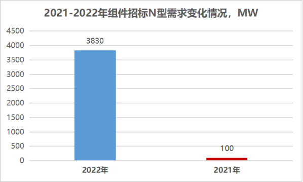 2022年已公布N型組件需求4230MW,較2021年全年增長4倍,根據(jù)測算,以N型TOPCON組件為例,TOPCON組件在項目端溢價約0.1元/瓦以上。