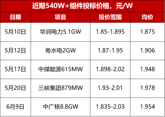 從5月開始,組件價格開始明顯上漲,5月15日以后,540W及以上組件價格上漲0.08元/W,廠家報價集中至1.95元-2元/W,且企業(yè)最高報價已達2.03元/W,投標均價已達1.96元/W。
