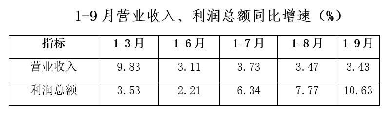 據(jù)國家統(tǒng)計局統(tǒng)計數(shù)據(jù),1-9月行業(yè)實現(xiàn)營業(yè)收入7319.73億元,同比增長3.43%,與上半年相比基本持平;實現(xiàn)利潤總額538.91億元,同比增長10.63%,增速較上半年顯著提高;完成出口交貨值996.3億元,同比增長9.3%。