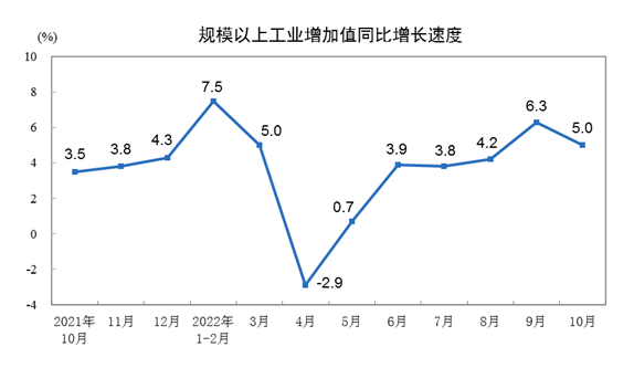 10月份,規(guī)模以上工業(yè)增加值同比實(shí)際增長(zhǎng)5.0%(增加值增速均為扣除價(jià)格因素的實(shí)際增長(zhǎng)率)。從環(huán)比看,10月份,規(guī)模以上工業(yè)增加值比上月增長(zhǎng)0.33%。1—10月份,規(guī)模以上工業(yè)增加值同比增長(zhǎng)4.0%。