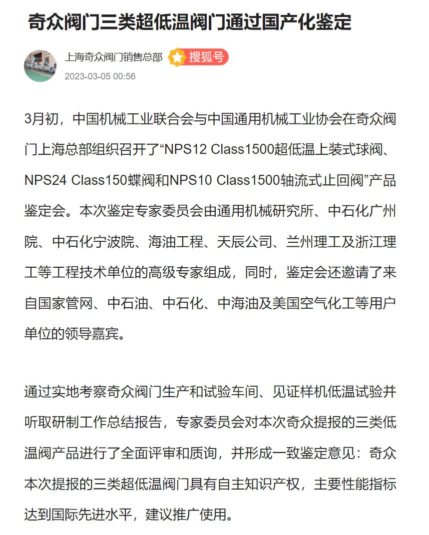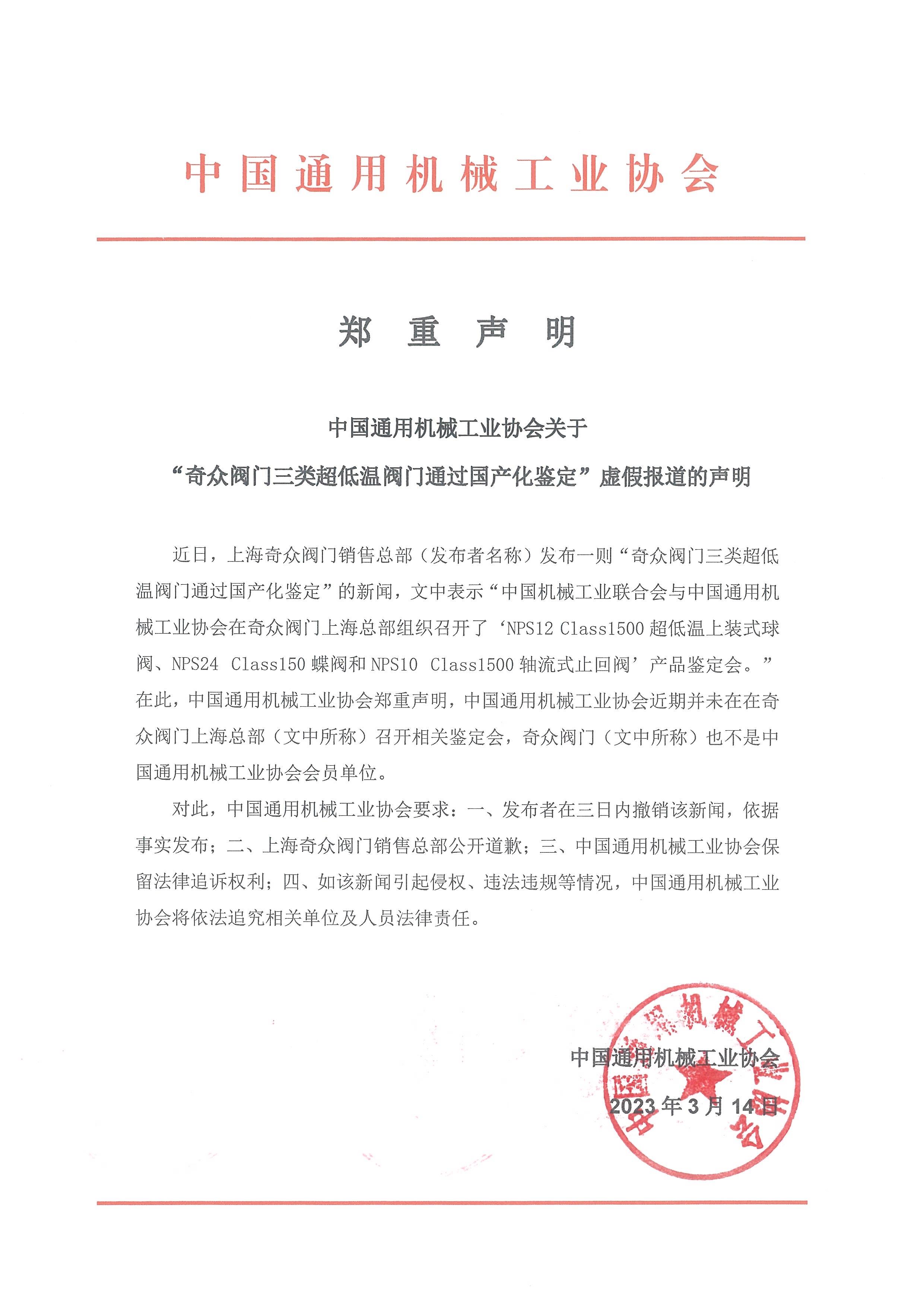 中國(guó)通用機(jī)械工業(yè)協(xié)會(huì)關(guān)于“奇眾閥門三類超低溫閥門通過國(guó)產(chǎn)化鑒定”虛假報(bào)道的聲明