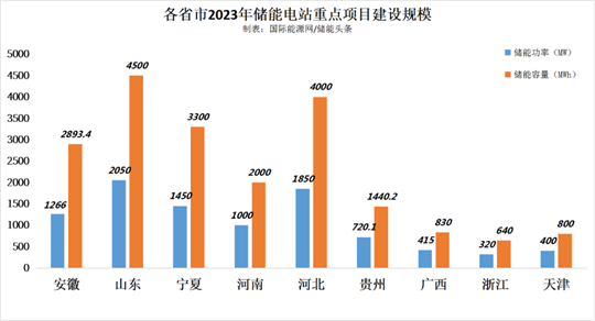 據(jù)據(jù)國際能源網(wǎng)/儲能頭條統(tǒng)計,截至目前,2023年安徽、山東、寧夏、河南、河北、貴州、廣西、浙江、天津等9個地方重點儲能建設(shè)項目累計達57個,規(guī)??傆嬤_9.5GW/20.4GWh。
