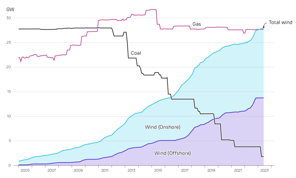 過去十年來,天然氣一直是英國最大的電力來源,而在此之前,自維多利亞時代以來,煤炭一直位居榜首。2011 年之前,煤炭是該國最大的裝機容量,但裝機容量從 28 吉瓦降至僅 2 吉瓦。