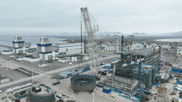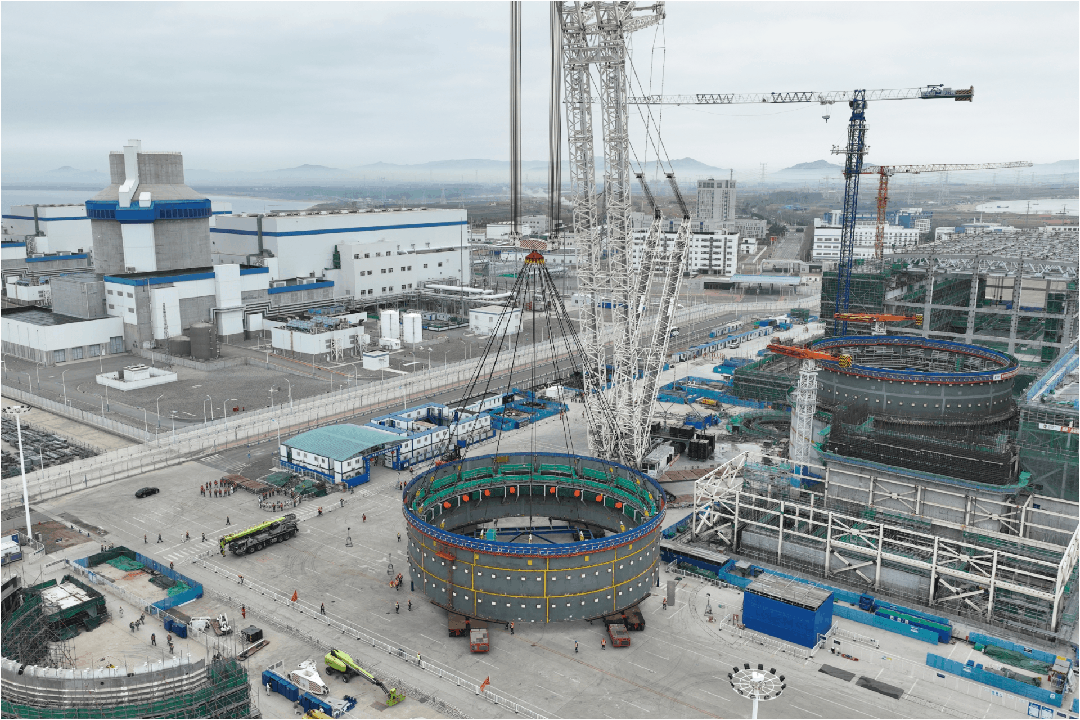 2024年3月16日9時16分,海陽核電3號機組核島鋼制安全殼筒體三環(huán)模塊順利吊裝就位。