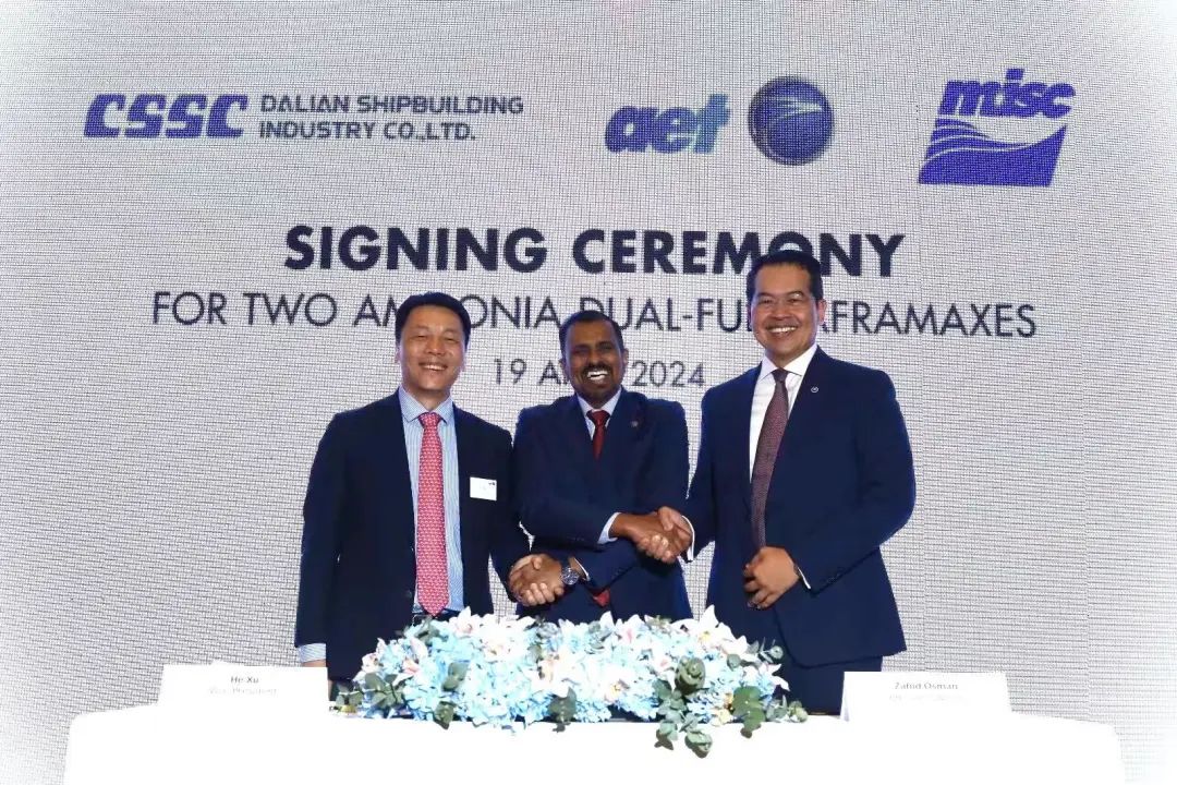 4月19日,中國船舶大連造船與馬來西亞國際航運公司MISC集團旗下油輪公司AET在馬來西亞吉隆坡簽署了2艘液氨雙燃料動力阿芙拉型油船建造合同。