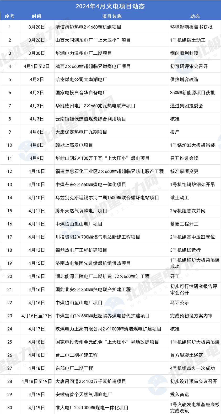 據(jù)北極星電力網(wǎng)不完全統(tǒng)計(jì),2024年4月,我國(guó)共有62個(gè)火電項(xiàng)目取得了重要進(jìn)展,其中2個(gè)項(xiàng)目核準(zhǔn),6個(gè)項(xiàng)目開(kāi)工、4個(gè)項(xiàng)目并網(wǎng)、4個(gè)項(xiàng)目投產(chǎn)/投運(yùn),涉及陜煤、國(guó)家能源集團(tuán)、大唐、華潤(rùn)電力等。