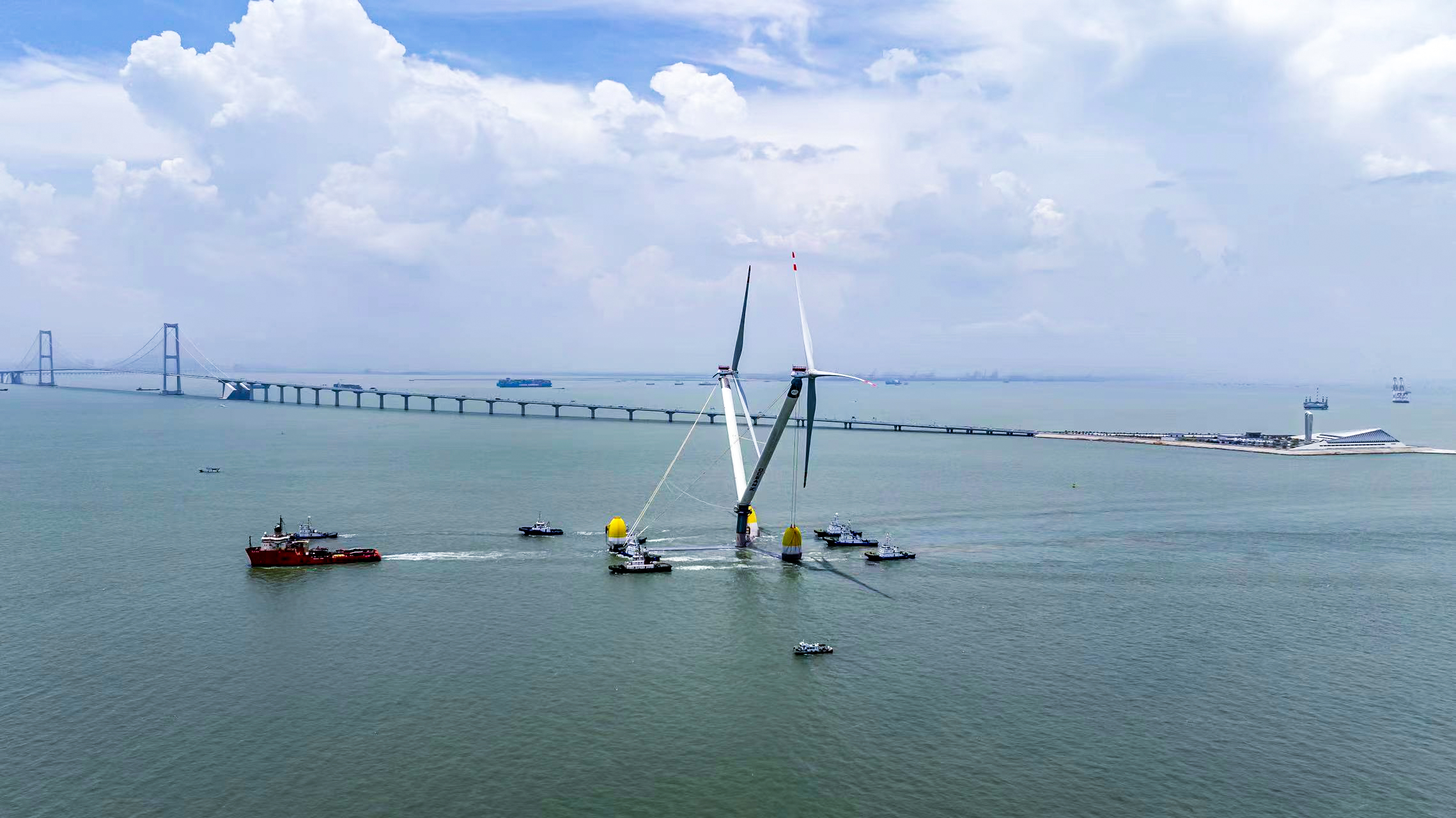 值得一提的是,“明陽天成號”實現(xiàn)了多項全球首創(chuàng)。其浮式基礎為全球首次采用抗壓能力達到115兆帕以上超高性能混凝土材料制造而成,這種混凝土材料強度達到普通混凝土的4倍左右。浮筒采用的“玻璃纖維外殼+XPS芯材+防護涂層材料”方案亦為世界首創(chuàng),突破了傳統(tǒng)浮筒采用純鋼結構或鋼混結構的限制。此外,翼型雙塔筒、雙主機、雙風輪的設計,以及拉索系統(tǒng)的應用均為全球首創(chuàng)。