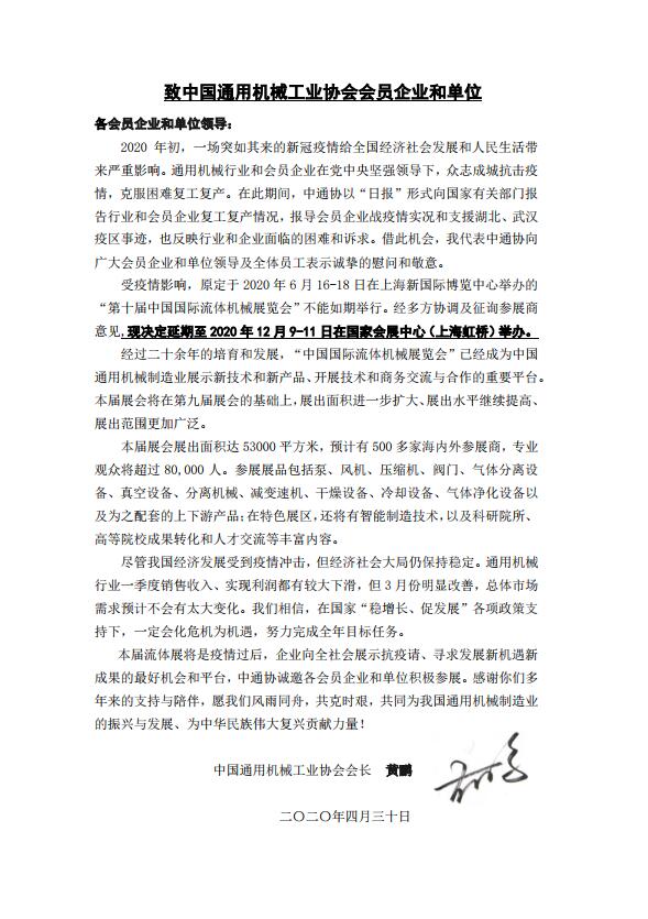 黃鸝會長關(guān)于IFME2020展會致會員單位的一封信